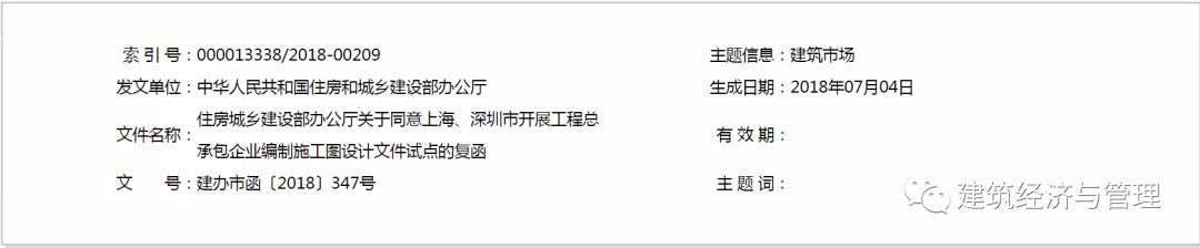 住建部发文《住房城乡建设部办公厅关于同意上海、深圳市开展工程总承包企业编制施工图设计文件试点的复函》。